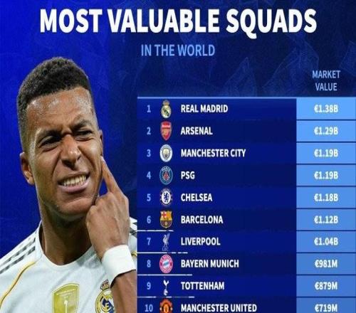 德转列总身价最高球队排名:皇马13.8亿欧居首,阿森纳第二