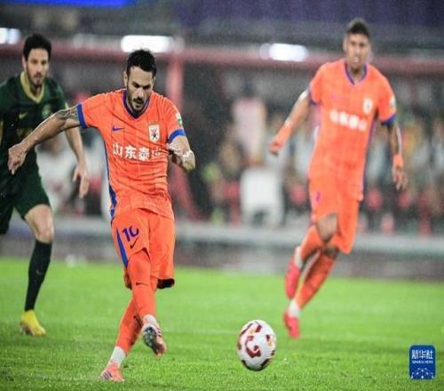 10月18日,山东泰山队球员克雷桑·巴塞洛斯(右二)在比赛中主罚点球命中。新华社记者 江汉 摄