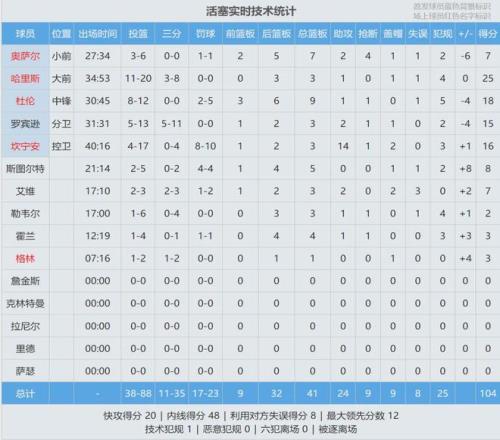 全场结束,活塞104-103险胜凯尔特人。这场不是飙分大战,但是非常精彩。布朗空砍32分11板2助,两罚不中太可惜。怀特在进攻端一言难尽,11中1得到4分9板5助2帽。哈里斯25分3板、杜伦18分9板、坎宁安16分3板14助2帽。
